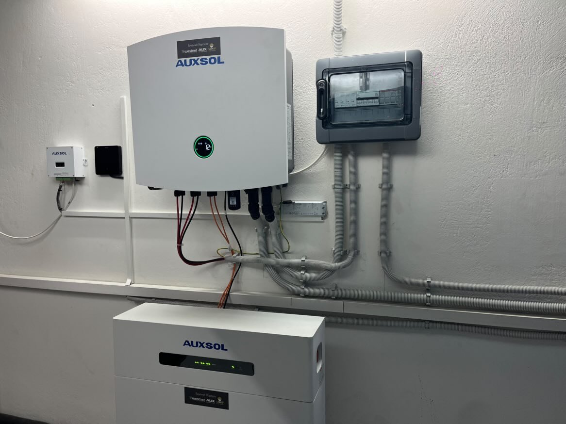 Στο πλαίσιο αυτό, προχωρήσαμε σε δωρεά στο Εθνικό Μετσόβιο Πολυτεχνείο μιας αντλίας θερμότητας AUX 16 kW τελευταίας τεχνολογίας με ψυκτικό R290, πλήρους υδραυλικού εξοπλισμού, φωτοβολταϊκού πεδίου 10 kW, μπαταρίας 10 kWh, τριφασικού υβριδικού inverter, καθώς και ολοκληρωμένου συστήματος διαχείρισης ενέργειας (ΗEMS). Ολόκληρο το σύστημα – αντλία θερμότητας, φωτοβολταϊκά, μπαταρία και inverter – διαθέτει δυνατότητα απομακρυσμένης παρακολούθησης και διαχείρισης.